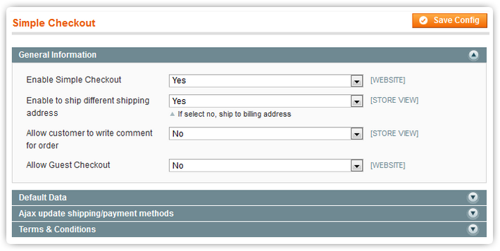 In the admin panel, you can simply choose to enable or disable the simple checkout then decide to allow or not allow to ship in different address or customers’ comment.