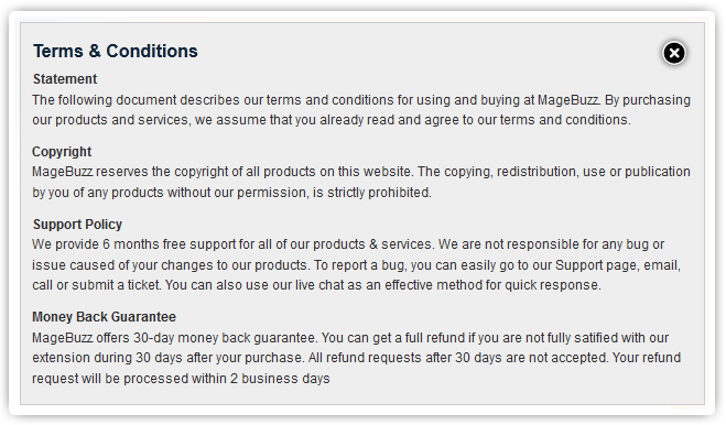 With necessary policy information about your store in a popup that you choose “ Yes” in “Enable Terms & Conditions” and import your content to the given box in backend. It allows customers to check & agree with "Terms and Conditions" before making a purchase on frontend.